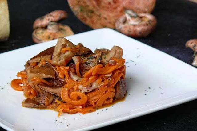 La receta de Pedro Manuel Serrano de la Cruz del blog enunaservilleta nos ha preparado una receta con los dos ingredientes del Reto de Otoño, un timbal con unos riquísimos níscalos y unos espagueti de calabaza y jamón ibérico, una combinación de ingredientes buenísima.