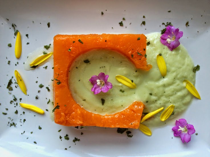 Cubitos tibios de calabaza con sabor ahumado,rellenos de crema densa de ajo frito , petejil y jamon , con champiñones y copitos de calabaza fritos de "Luis Enrique Manso Vega"